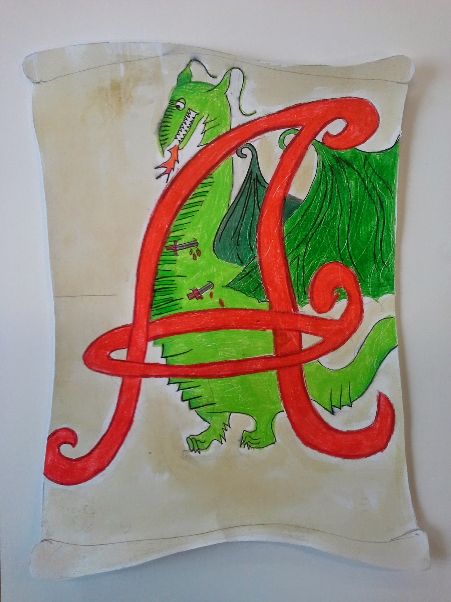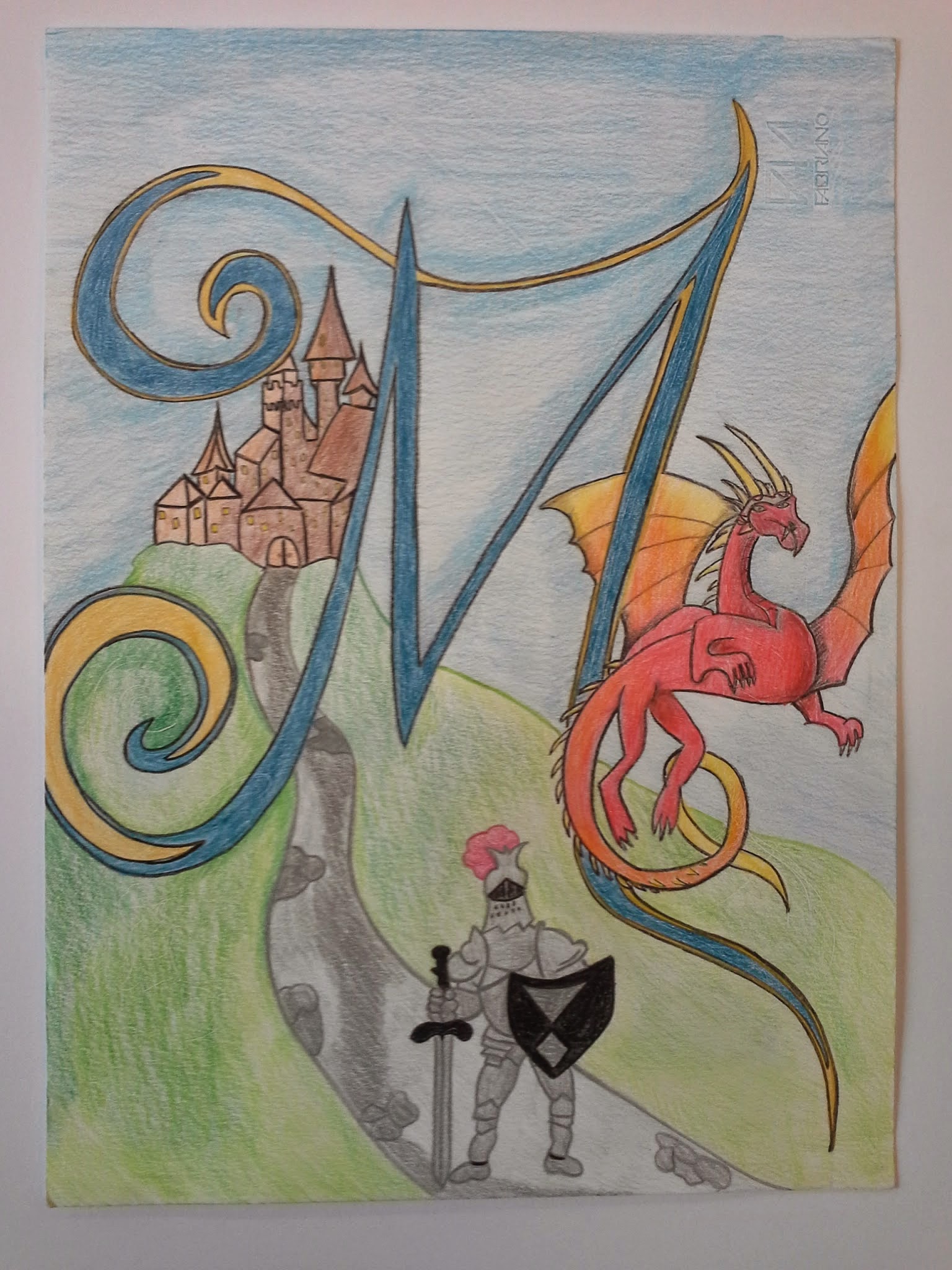 Parlare di Medioevo senza studiare qualcosa degli spendidi esempi d’arte prodotti nei monasteri ad opera dei monaci copisti e miniaturisti è davvero impossibile.. Così nelle seconde abbiamo lavorato sul tema delle miniature medievali rielaborandole attraverso l’ideazione di un capolettera (con l’iniziale del proprio nome) reinterpretato con disegni e paesaggi di stampo medievale.