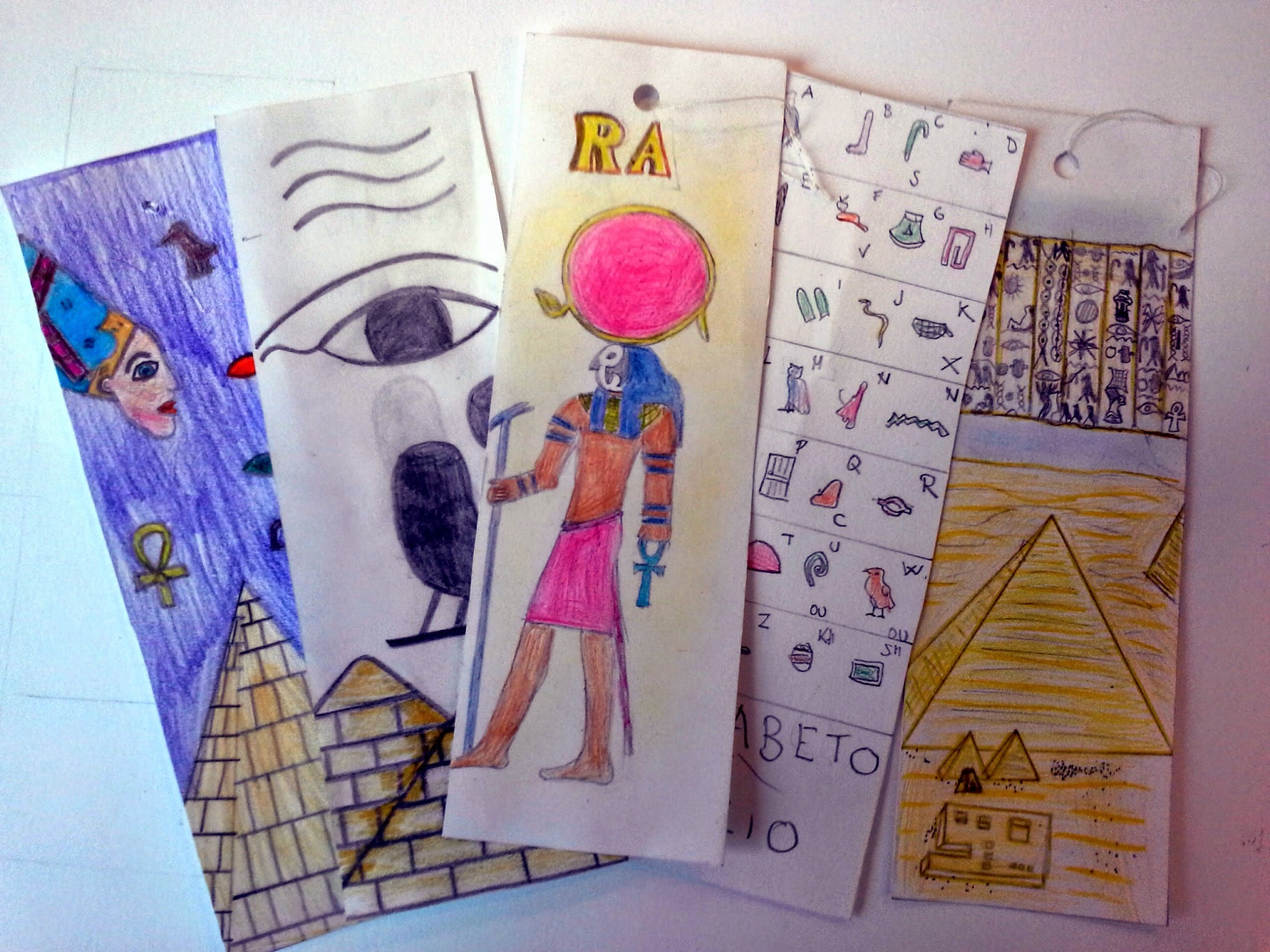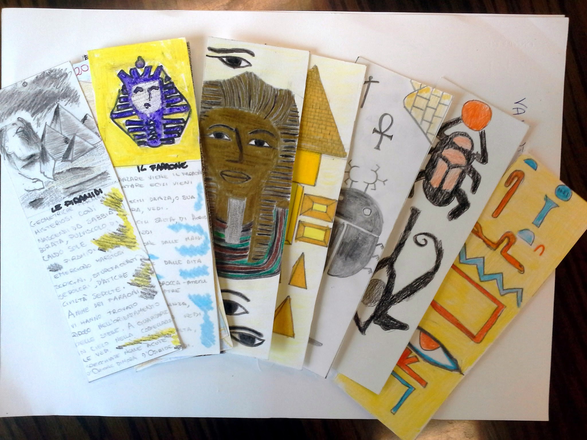 Affiancando lo studio dell’arte egizia (qui i post relativi) alle attività grafico creative, abbiamo realizzato con i ragazzi di prima C alcuni segnalibri, illustrandoli con immagini ispirate all’arte dell’antico Egitto.