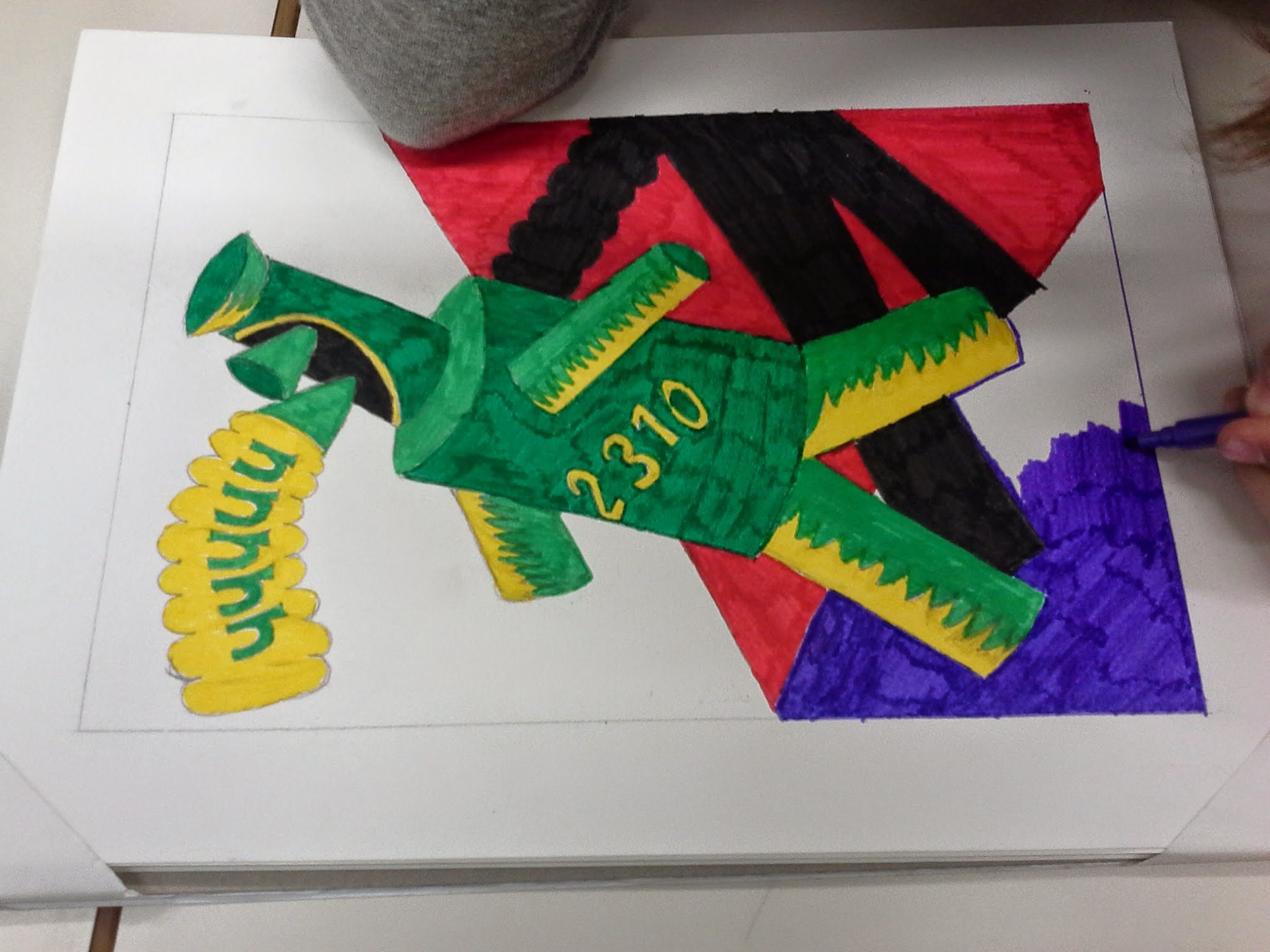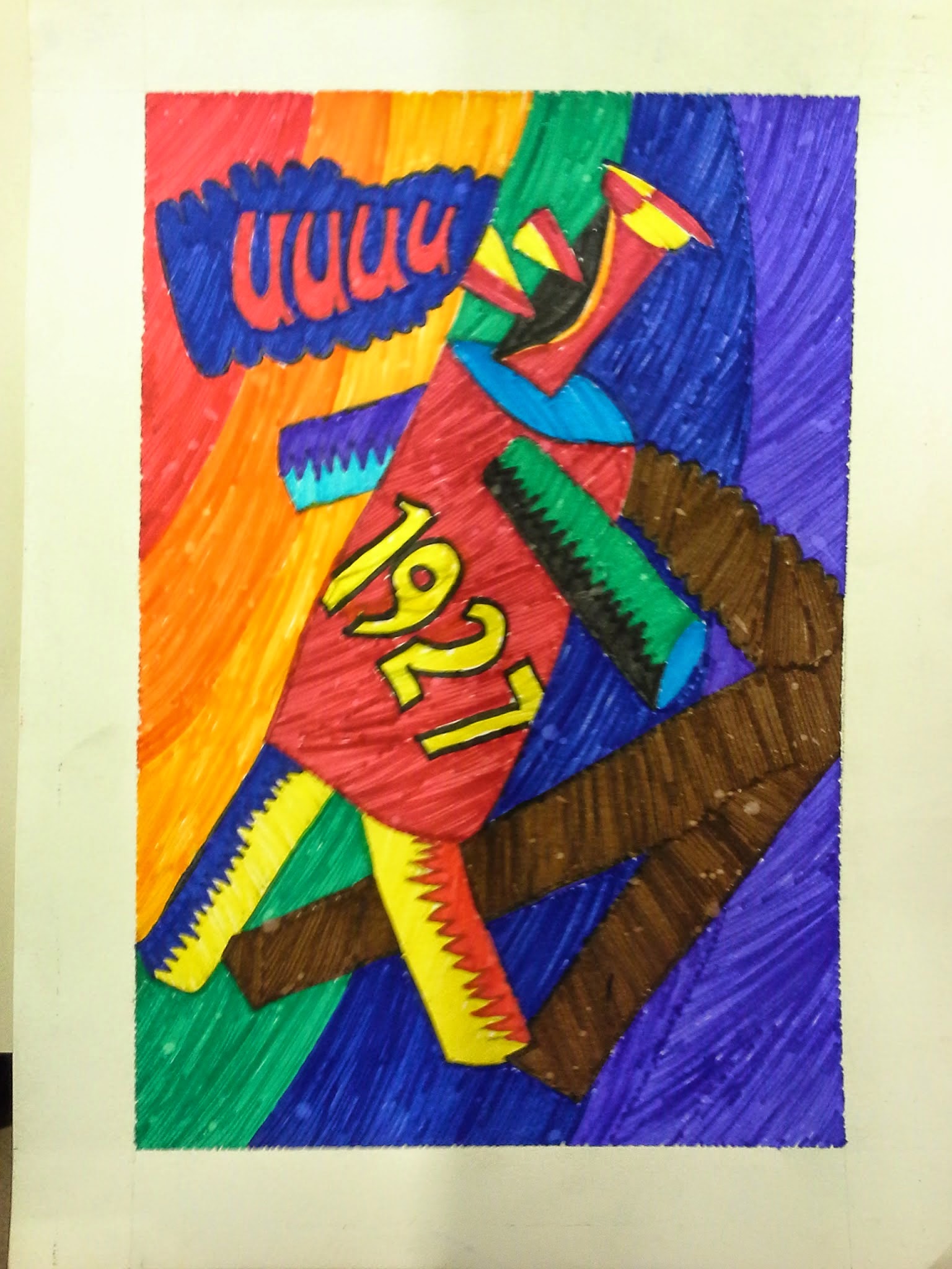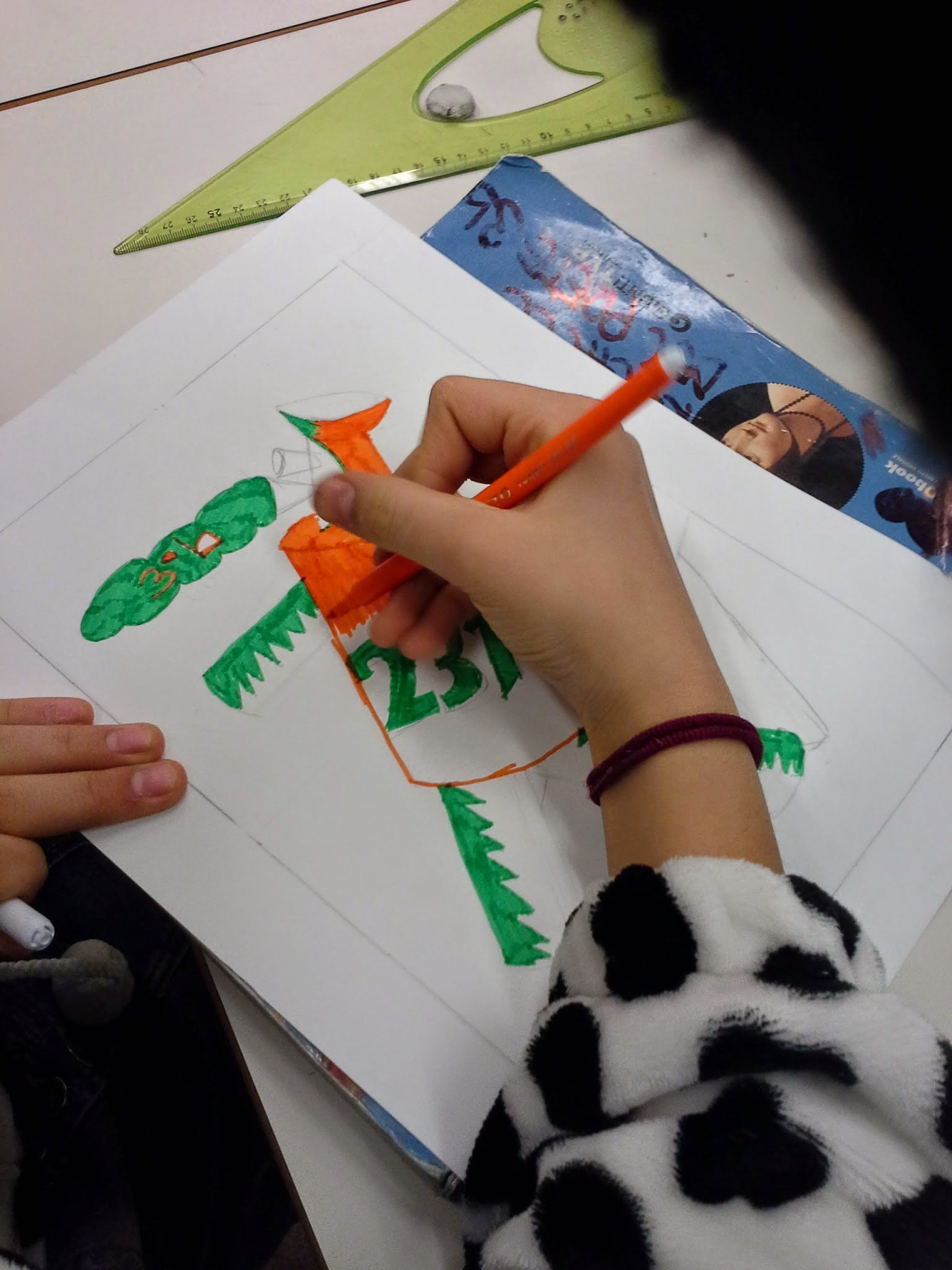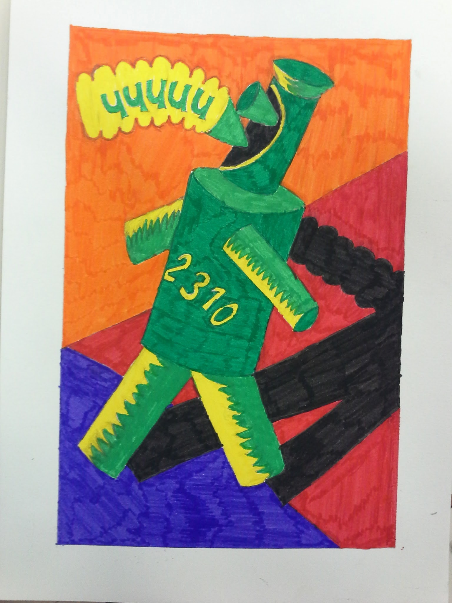 Abbiamo iniziato in 3^B a riprodurre uno dei tanti manifesti pubblicitari elaborati dal futurista F.Depero. Il lavoro in sè è piuttosto semplice: osservando la figura (una sorta di robot) dal manifesto originale, la si riproduce il più possibile fedelmente a matita, per poi ultimare il disegno colorando con i pennarelli.