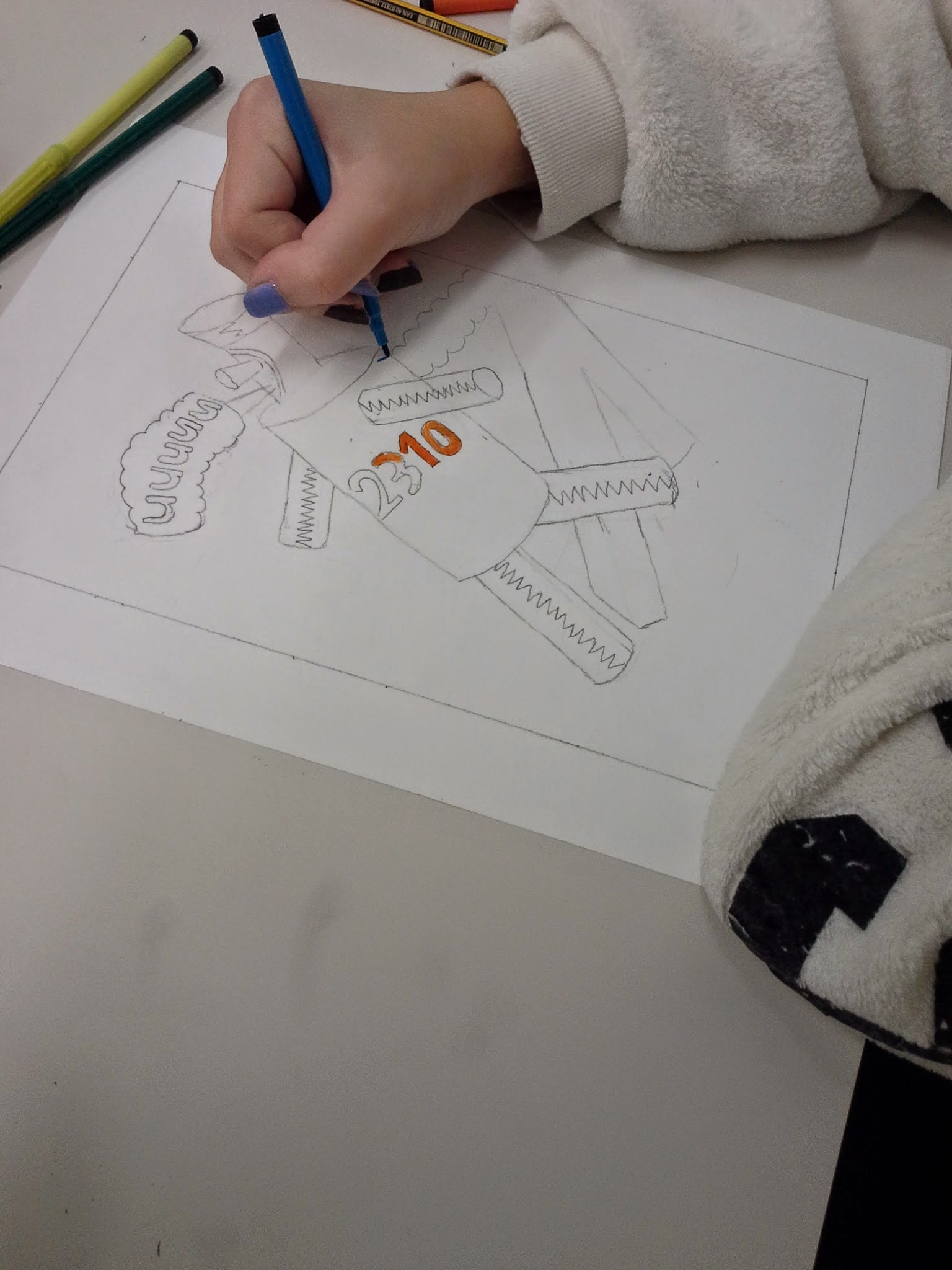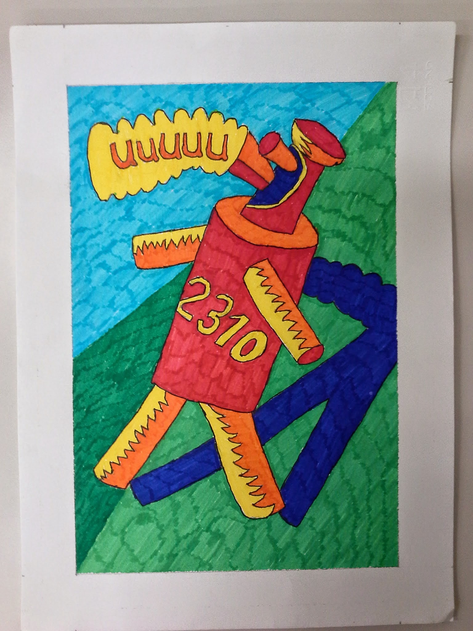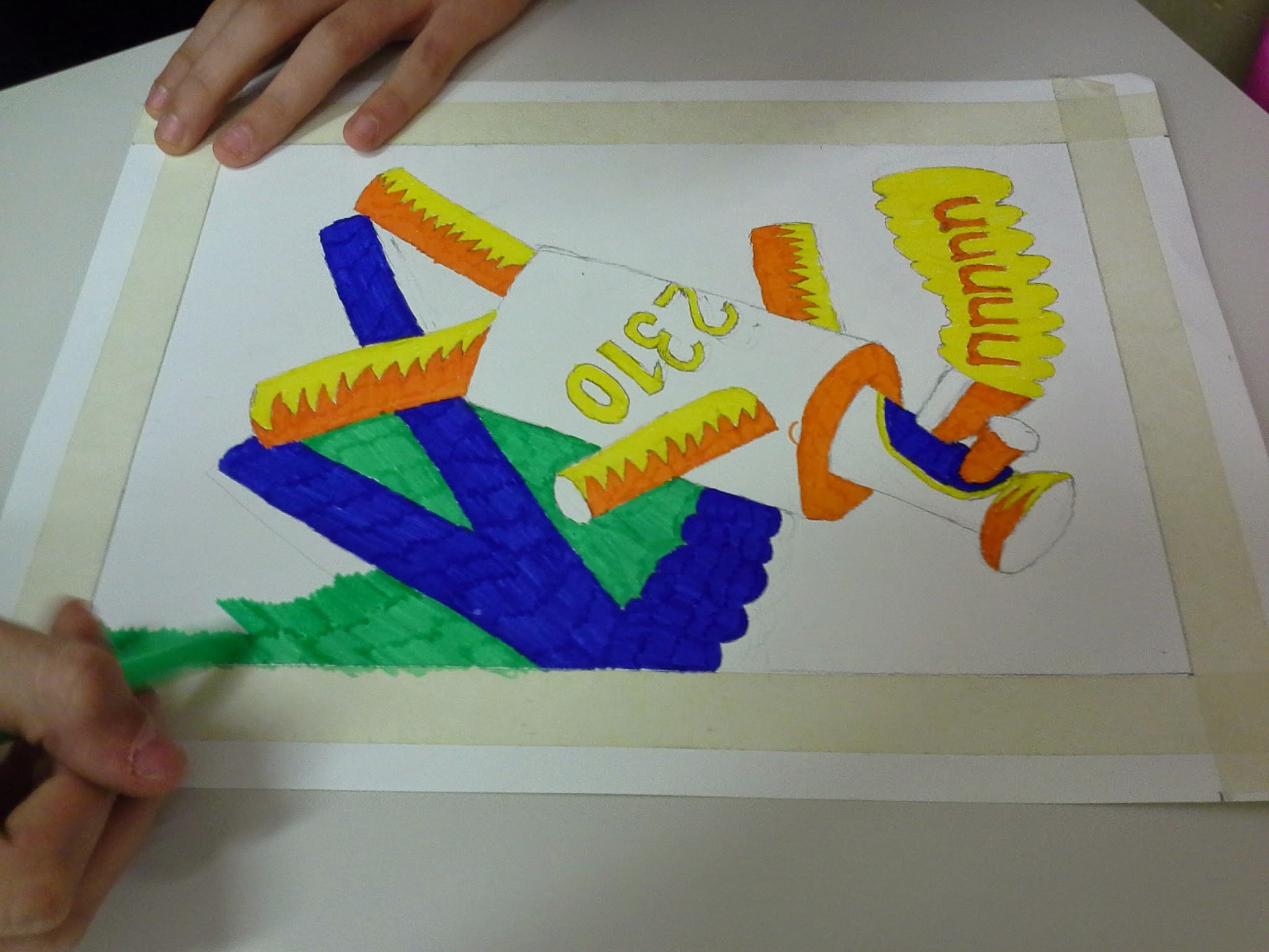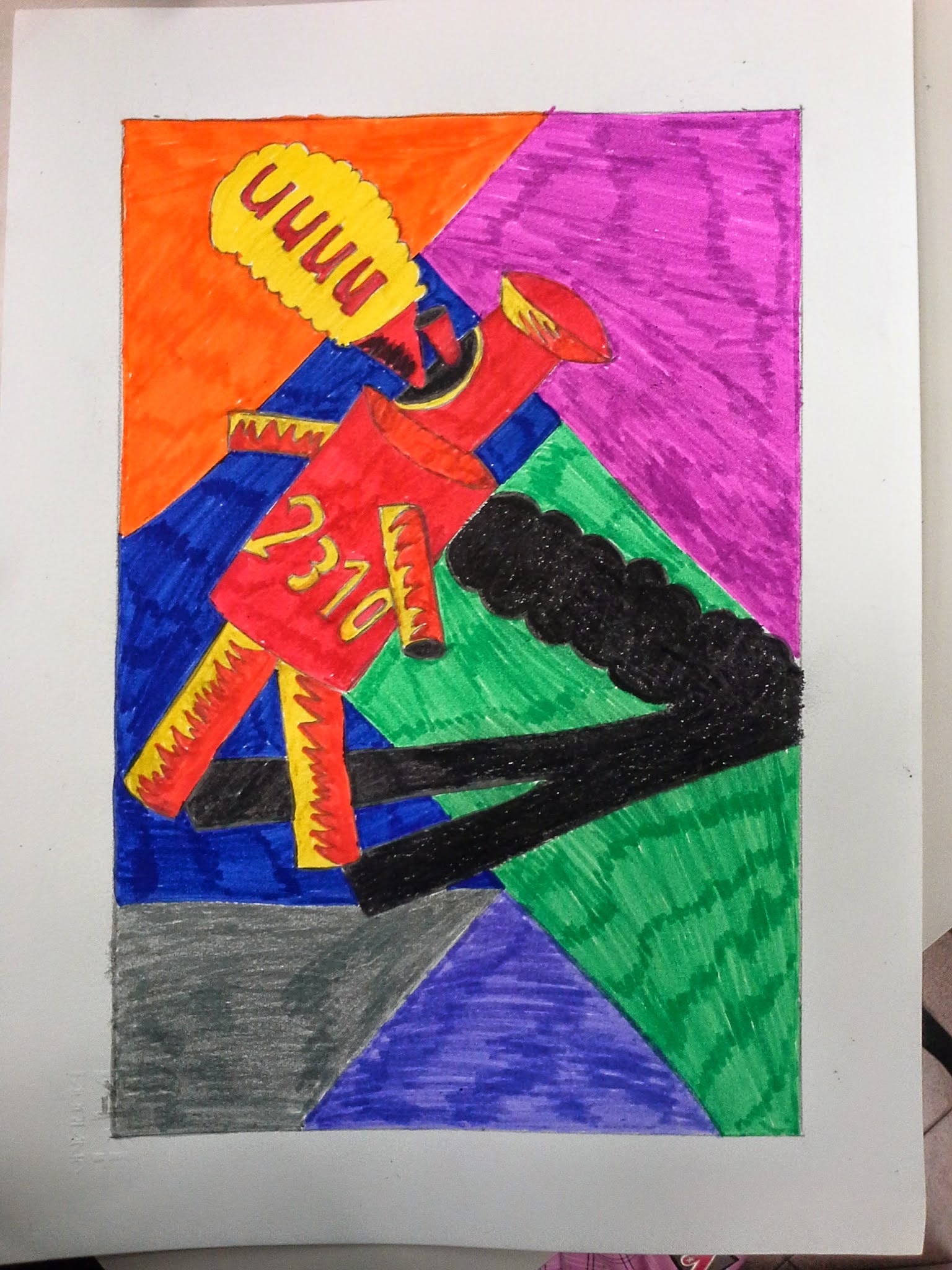 Abbiamo iniziato in 3^B a riprodurre uno dei tanti manifesti pubblicitari elaborati dal futurista F.Depero. Il lavoro in sè è piuttosto semplice: osservando la figura (una sorta di robot) dal manifesto originale, la si riproduce il più possibile fedelmente a matita, per poi ultimare il disegno colorando con i pennarelli.