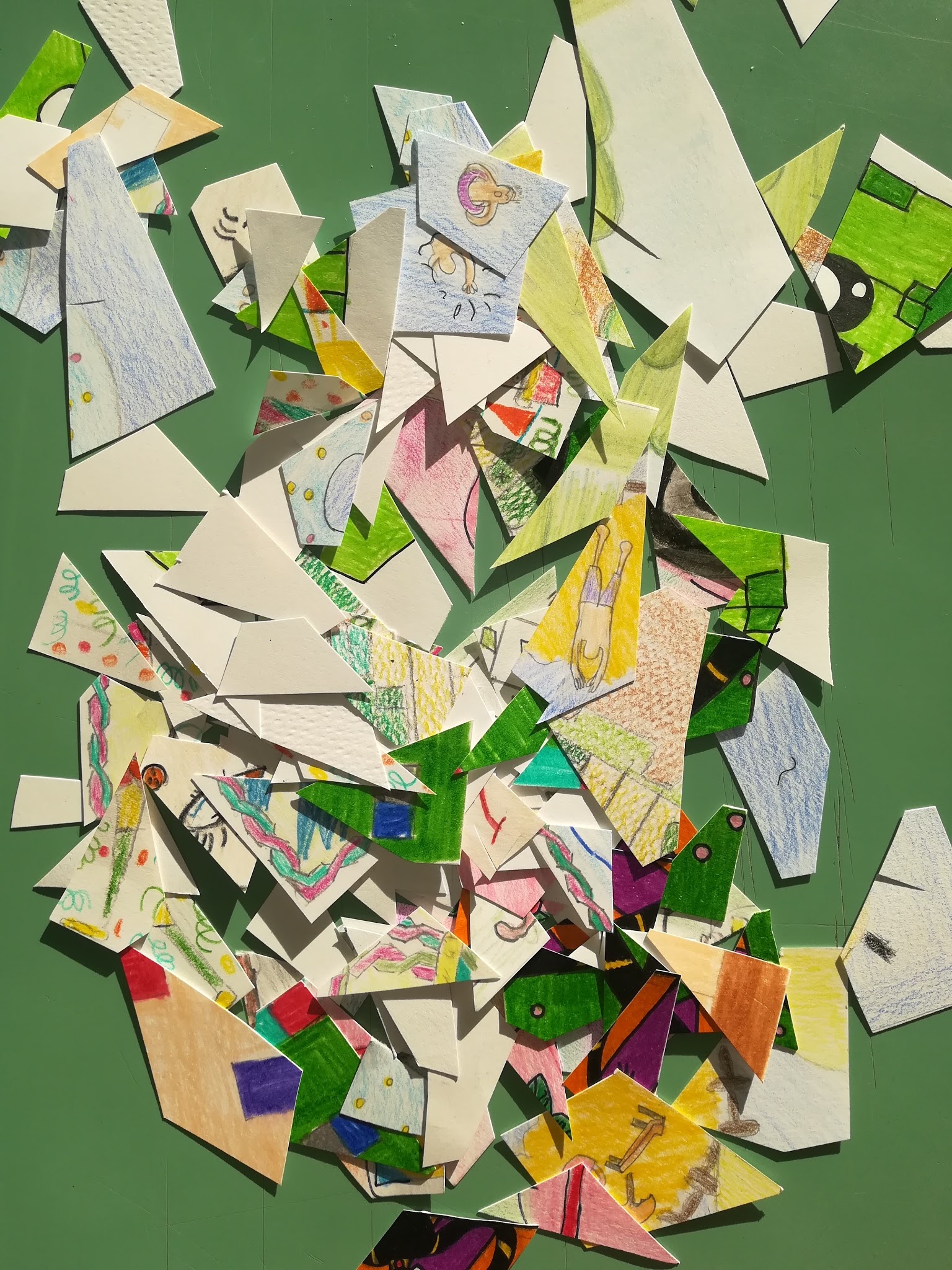 2- ogni disegno è stato poi ritagliato in tanti pezzetti di varia forma e dimensione
